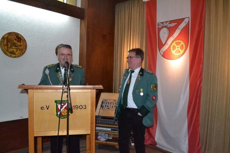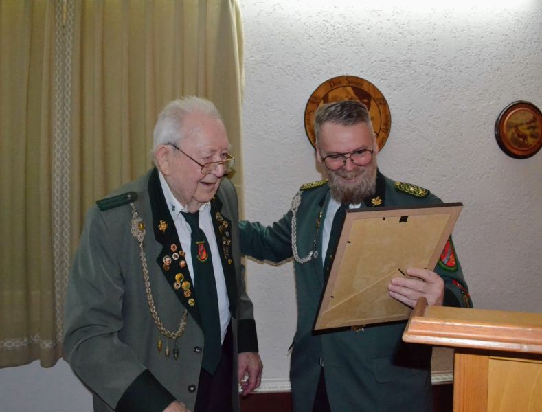 Trotzdem ging er nicht leer aus. Zusätzlich zu einer Ehrenurkunde bekam er ein Bild mit einer Widmung und einen Ehrenplatz in unserem Schützenhaus. Das Standing Ovation trieben ihm und seiner Familie ein kleines Tränchen in die Augen.